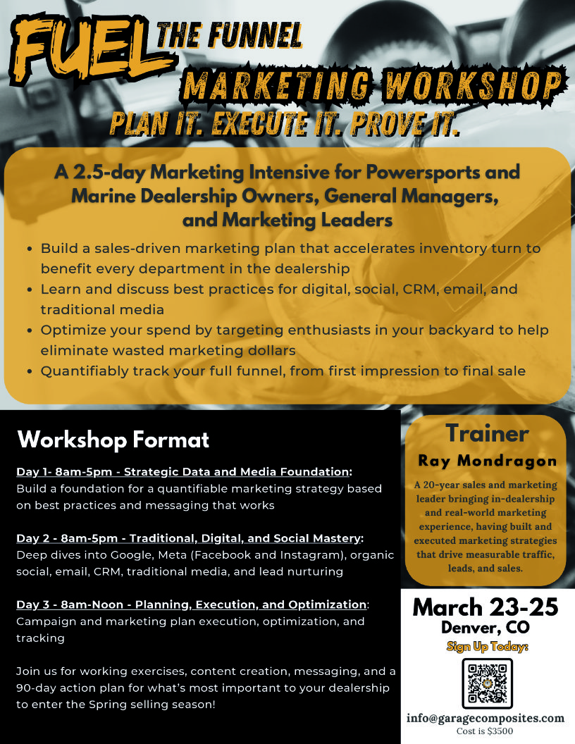 Plan it. Execute it. Prove it. A 2.5-day Marketing Intensive for Powersports and Marine Dealership Owners, General Managers, and Marketing Leaders.